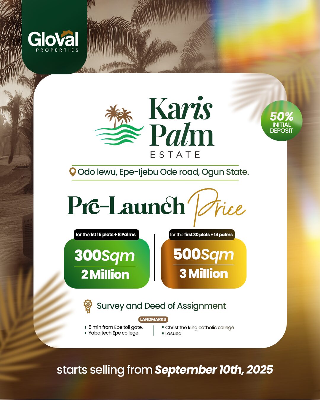 Karis Palms is more than a real estate opportunity; it’s a pathway to creating generational wealth. We offer investors access to strategic landownership in Ijebu-Ode, a rapidly developing area, and the added advantage of participating in Nigeria’s high-demand palm oil industry. Our goal is to develop 300,000 acres of productive oil palm plantations, creating opportunities for wealth building, sustainability, and community development.